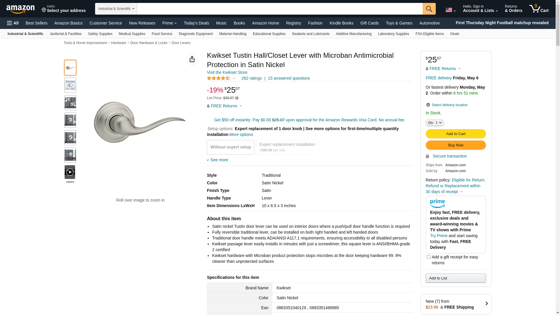 Kwikset Tustin ANSI/BHMA Grade 2 1-3/4 Inch Satin Nickel Steel Passage Latch