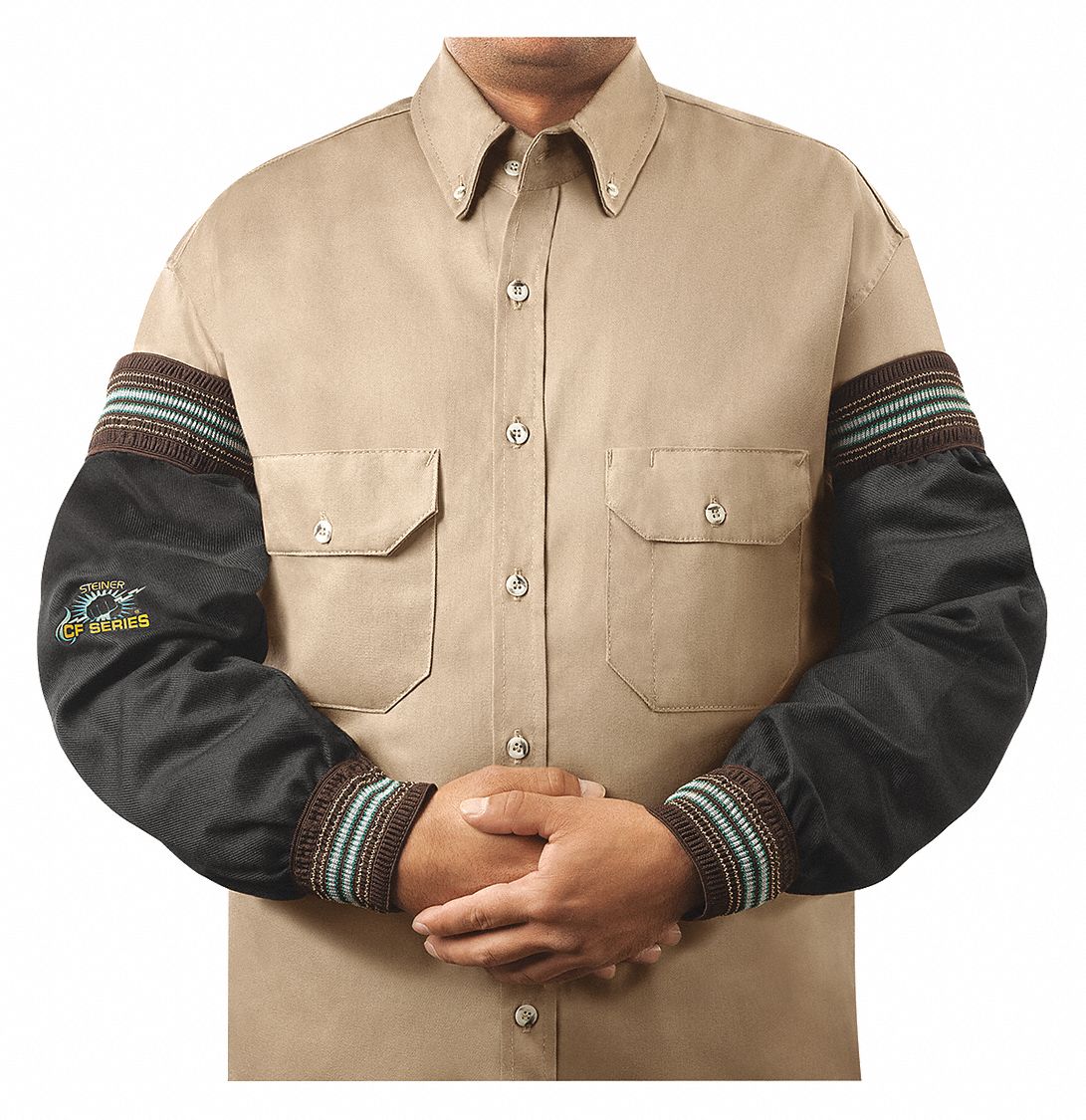 CF Woven Carbonized Fiber Sleeves - 10 oz. CF Permanently Flame Resistant Fabric, 23" Long, 2-1/2" Wide Elastic Cuff, Top & Wrist, Nomex Sewn. Carbonized fibers blended with para-aramid strengthening fibers makes the CF material inherently flame resistant, tough, lightweight, breathable, and comfortable. Package of 1
