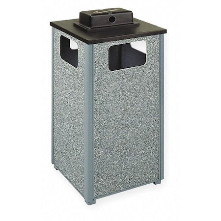 * 24 gallon capacity heavy duty steel ash/trash receptacle with weather urn. Four 9 in. W x 5 in. H disposal openings permit the insertion of waste from all directions. Weather Urn protects contents urn from the elements and removes for easy emptying of rigid plastic inner liner. Uni-Koat Powder coated finish resists fading. Aggregate stone panels have a Class A fire rating. Specify color: Brown w/Desert Brn Stone Panels (201), Green w/ Desert Brn Stone Panels (202), Bronze w/ Gray Stone Panels (6000), Gray w/Gray Stone Panels (2000). Constructed of 30% or more recycled steel and is 100% post consumer recyclable. 13.5 in. Sq. x 38 in. H