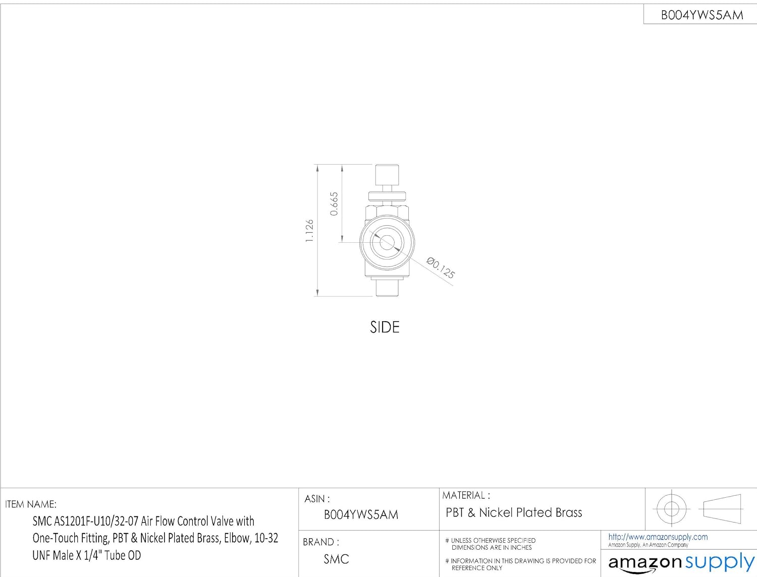SMC AS1201F-U10/32-03 Air Flow Control Valve with Push-to-Connect Fitting, PBT & Nickel Plated Brass, Elbow, 10-32 UNF Male x 5/32" Tube OD