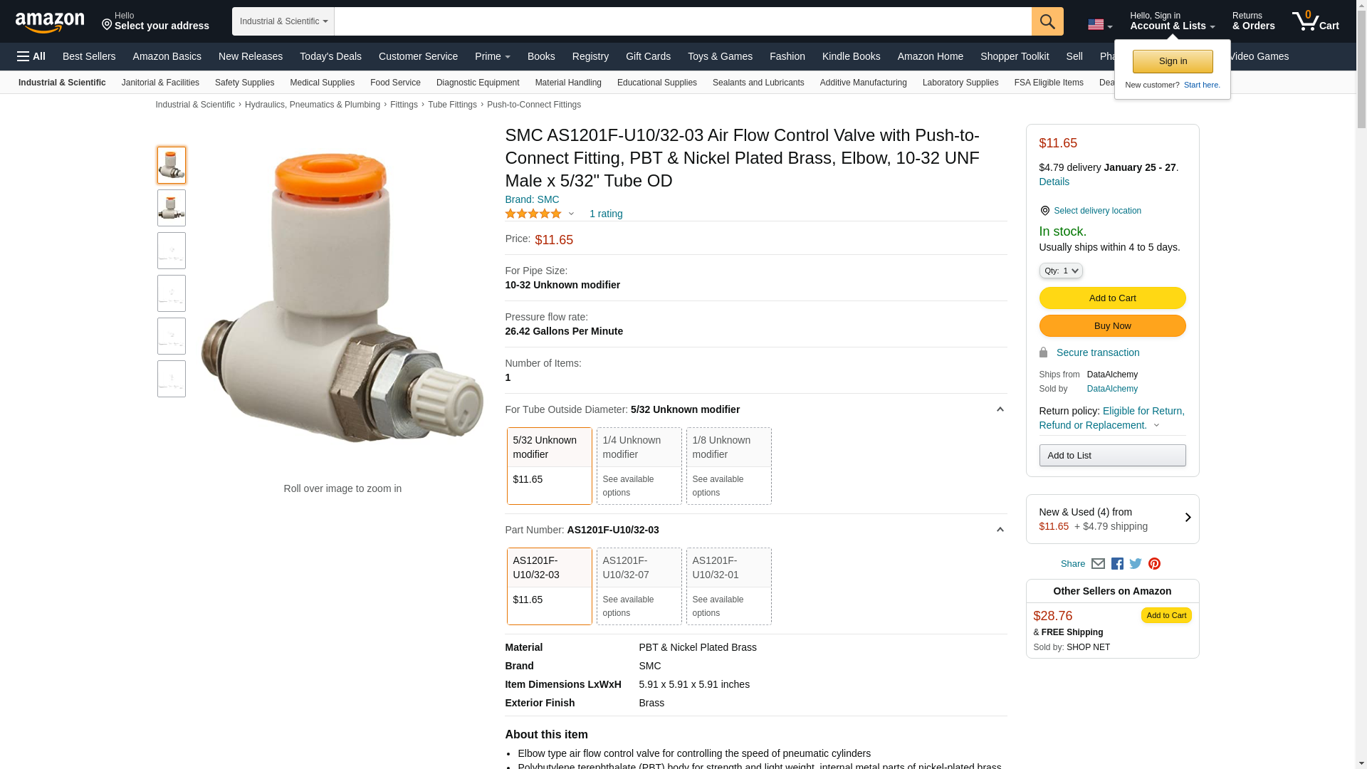 "SMC Corporation AS1201F-U10/32-03 Speed Control, Flow Control, elbow, meter-out, 10-32UNF port, for 5/32 tube"