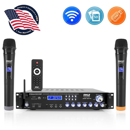 Pyle Bluetooth Multi-Channel Hybrid Pre-Amplifier System - 3000W Home Audio Rack Mount Stereo Power Amplifier Receiver w/ Radio, USB, UHF, Dual Wireless Karaoke mic, Speaker Sound System -PWMA4004BT