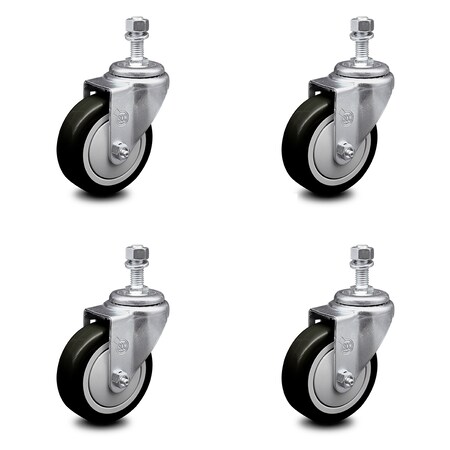 4 Inch Black Polyurethane Wheel Swivel 12mm Threaded Stem Caster Set SCC