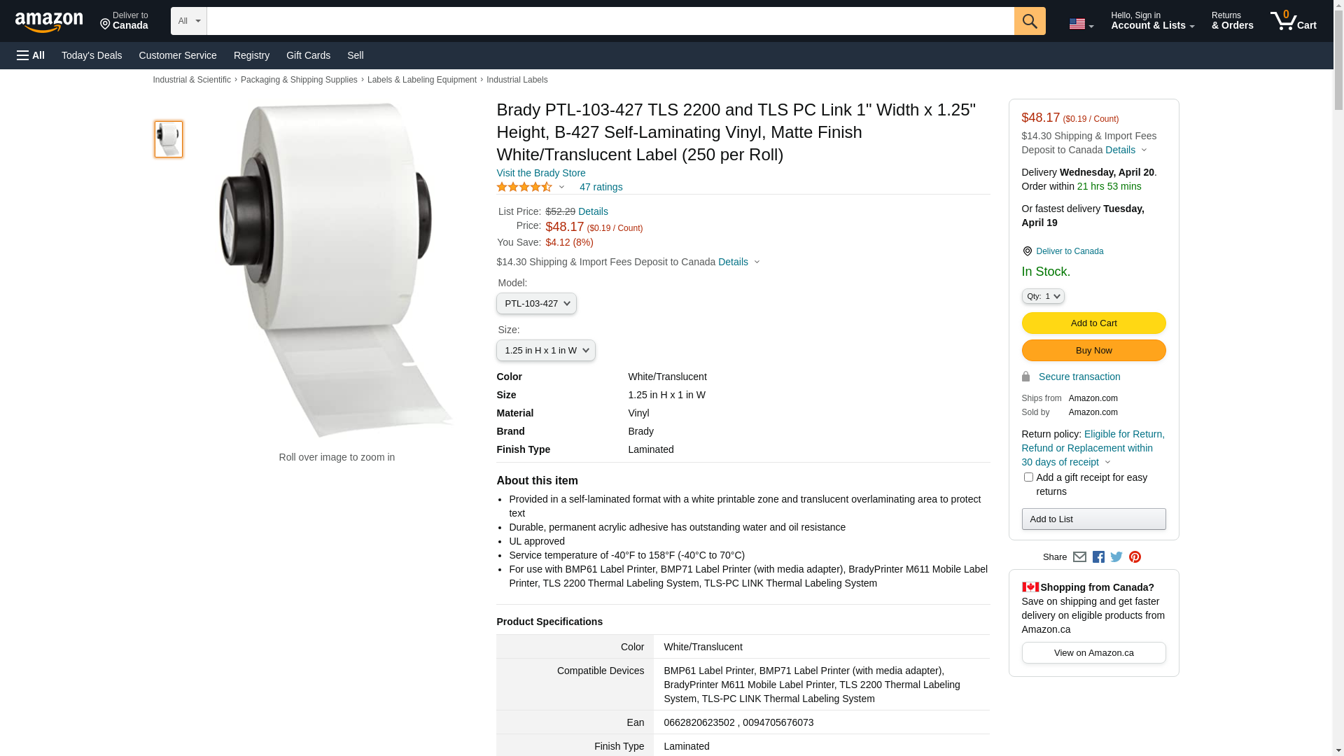 Brady PTL-103-427 TLS 2200 and TLS PC Link 1" Width x 1.25" Height, B-427 Self-Laminating Vinyl, Matte Finish White/Translucent Label (250 per Roll)