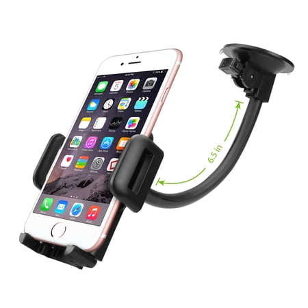 <ul> <li>Jaws slide open to 3.5 inches wide</li> <li>Suction Mount to windshield or to special disk to put on dash.</li> <li>Arm is rigid yet still bendable to any position</li> <li>Holder rotates to hold your phone either horizontally or vertically.</li> </ul>