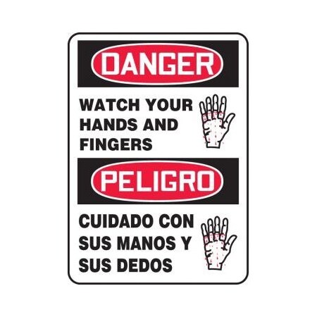 Accuform SBMEQM030VA Aluminum Spanish Bilingual Sign, Legend"Danger Watch Your Hands and Fingers/PELIGRO CUIDADO CON SUS Manos Y SUS DEDOS" with Graphic, 14" Length x 10" Width, Red/Black on White