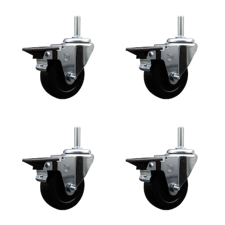 Soft Rubber Swivel Threaded Stem Caster Set of 4 w/3.5" x 1.25" Black Wheels and 3/4" Stems - Includes 4 with Posi Lock Brakes - 800 lbs Total Capacity - Service Caster Brand