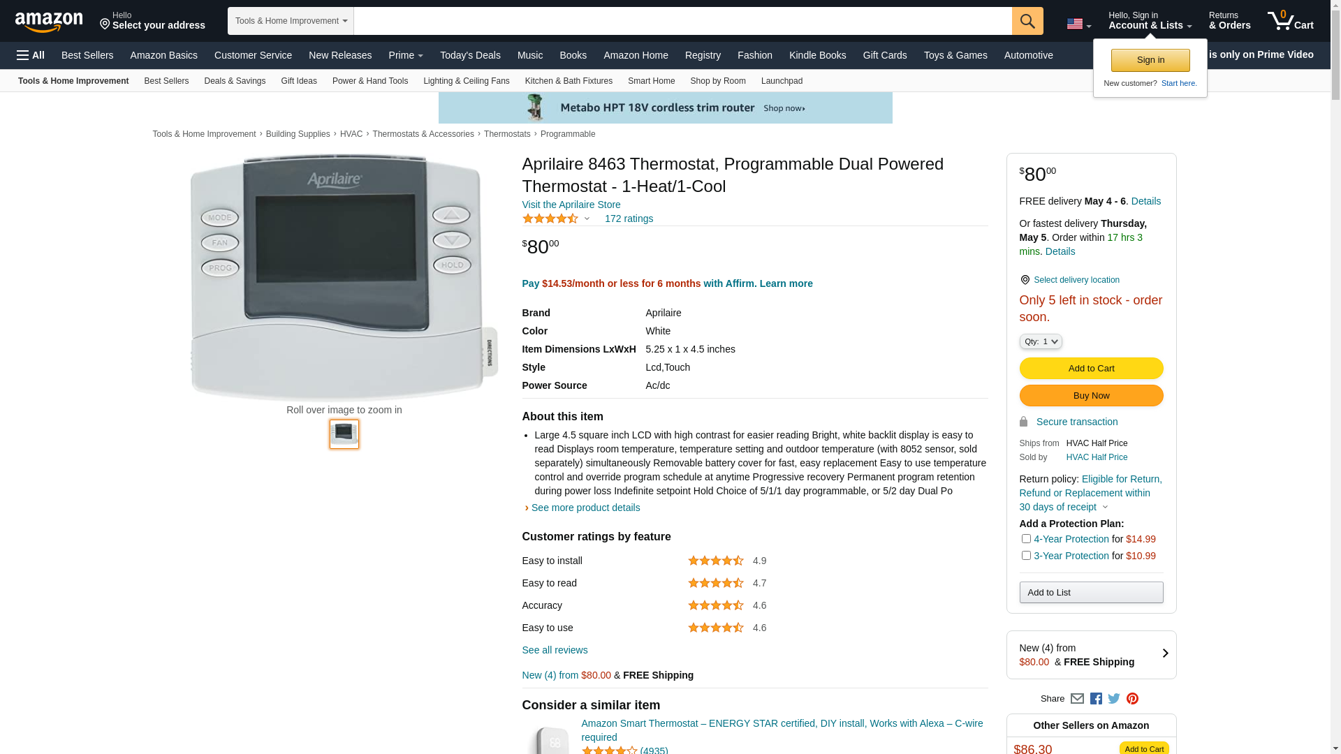 About the Aprilaire 8463 Programmable Dual Powered Thermostat: 1 Heat/1 Cool Take total control of the heating and cooling of your home with the Aprilaire 8463 Programmable Dual Powered Thermostat 1 Heat/1 Cool. This programmable device allows you to specify the temperature in your home on a weekly and weekend basis, giving you customizable options for each setting. Set your temperature preferences for the five weekdays, then choose from either a two day setting on the weekend or a day to day fluctuation. This 4.5 inch LCD screen provides optimal information regarding your temperature, while the touch soft keys make programming your schedule a breeze. Upgrade to a programmable thermostat today and take full advantage of all its unique features. Designed to work with single or multistage heat pump and hydraulic systems, this mercuryfree thermostat is an excellent choice for your first programmable unit. The Aprilaire 8463 Programmable Dual Powered Thermostat 1Heat/1 Cool comes with a five year manufacturerrsquo;s warranty to ensure that your device works properly for years to come. Aprilaire 8400 Series thermostats have an Integrated AutoChangeover Mode for Heating amp; Cooling Additional Information: