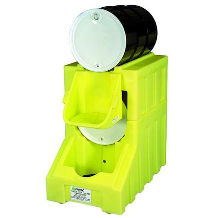' Drum Dispensing and Containment System, Number of Drums (2) 55 Gallon Drums, Height 33 In., Length 31 In., Width 53 In., Spill Capacity 66 gal., Material Polyethylene, Load Capacity 1600 lb., Yellow, Includes Dispensing Shelf With Drain Hole, Standards EPA 40 CFR 264.175 '