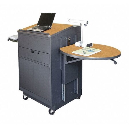 MVLMA3030OKDT Color: Oak Laminate Features: -Work surface, ideal for document cameras and student interaction. -Slanted lectern surface with pencil stop. Product Type: -AV Carts. Commercial Use: -Yes. Country of Manufacture: -United States. Primary Material: -Metal. Shelves Included: -Yes. Casters Included: -Yes. Storage Cabinets Included: -Yes. Number of Shelves: -3. Pull-Out Shelf: -Yes. Dimensions: -Speaker: 4''. Overall Width - Side to Side: -30". Overall Depth - Front to Back: -30". Overall Product Weight: -200 lbs. Overall Height - Top to Bottom: -46".