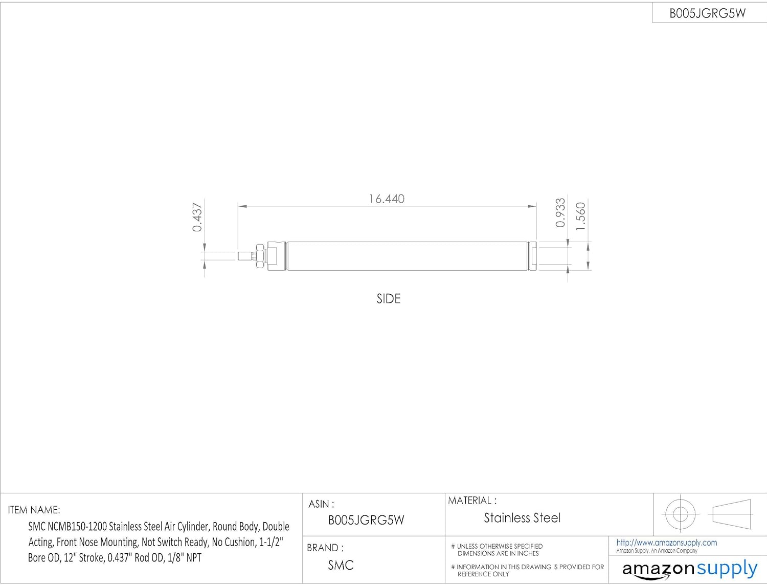 SMC NCMB150-0600 Stainless Steel Air Cylinder, Round Body, Double Acting, Front Nose Mounting, Not Switch Ready, No Cushion, 1-1/2" Bore OD, 6" Stroke, 0.437" Rod OD, 1/8" NPT