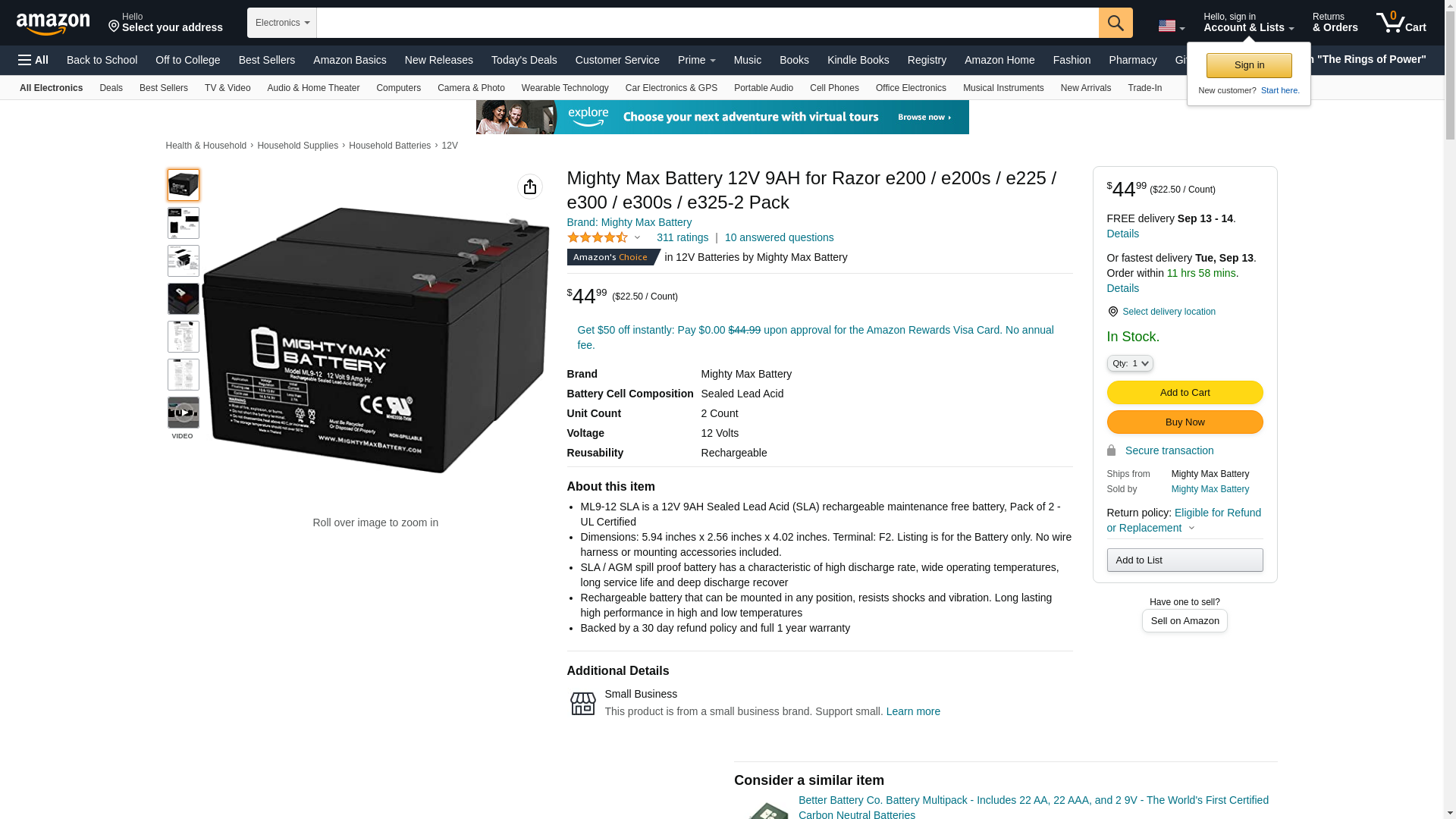 Delivering power when you need it, the Mighty Max ML9-12 12 Volt 9 AH uses a state of the art, heavy-duty, calcium-alloy grid that provides exceptional performance and service life in both float and cyclic applications.<br>The ML9-12 is an Absorbent Glass Mat (AGM) technology with a valve regulated design, that can be used in enclosed and indoor environments without leaking or maintenance, providing a superior performance for thousands of models.<br>Mighty Max SLA batteries are utilized in a wide variety of applications including; Consumer Electronics, Electric Vehicles, Engine Starters, Golf Carts, Hunting, Lawn and Garden Tools, Medical Mobility, Motorcycles, Power sports, Portable Tools, Solar, Toys and Hobby, Access Control Devices, Emergency Lighting, Security and more.<br><b>Specifications: </b><br>Voltage: 12 Volt<br>Amperage: 9 AH<br>Chemistry: SLA, AGM<br>Terminal: F2<br>Quantity: 2 Batteries<br><b>Battery Dimensions: </b><br>5.94 in x 2.56 in x 4.02 in<br>Weight: 5.10 Lbs<br><b>Warranty</b><br>1 Year <br/>Genuine Mighty Max battery Product