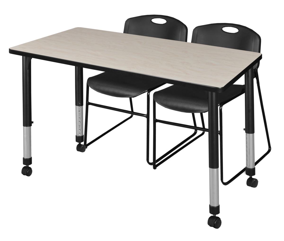 - Mobile Rectangle Classroom Table and Chairs Set includes 48" x 24" Table and 2 Black Zeng Stack Chairs.