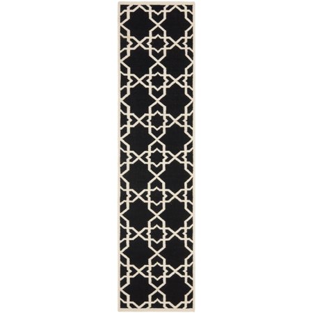Morrocan inspired design and dense hand-woven wool pile highlight this handmade dhurrie rug. This floor rug has a black background and displays stunning panel colors of ivory. <br /> <br /> <ul> <li>Primary materials: Wool</li> <li>Pile height: 0.25 inches </li> <li>Style: Transitional</li> <li>Primary color: Black</li> <li>Pattern: Geometric</li> </ul> <br /> <b>Tip: We recommend the use of a <a href="http://www.overstock.com/Home-Garden/Rug-Pads/1285/subcat.html"> <u>non-skid pad</u></a> to keep the rug in place on smooth surfaces.</b> <br /> <br /> <i>All rug sizes are approximate. Due to the difference of monitor colors, some rug colors may vary slightly. We try to represent all rug colors accurately. Please refer to the text above for a description of the colors shown in the photo.</i> <br />