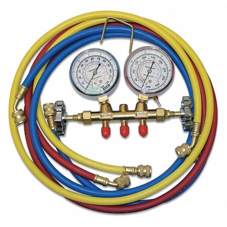 | Feature | Price For: Each Includes: Hanger Hook, Hose Holder, Two Hand Wheels Number of Valves: 2 Number of Hoses: 3 Refrigerant Application: R-12, R-22, R-134A Material: Brass Features: Hoses 500 psi Max WP and 2500 psi Burst Gauges Low Side Blue: 0 to 250 psi Item: Mechanical Manifold Gauge Set Vacuum Port Size: 1/4" Hose Length: 60" Gauges High Side Red: 0 to 500 psi |