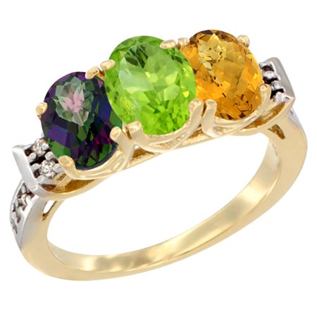 14K Yellow Gold Natural Mystic Topaz, Peridot & Whisky Quartz Ring 3-Stone Oval 7x5 mm Diamond Accent, sizes 5 - 10