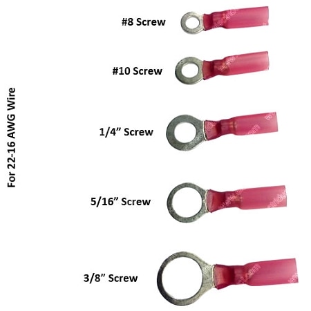 The Electriduct Heat Shrink Ring Terminals are Perfect for making new or replacing electrical connections. Our ring terminals work with bolts, studs or screws to quickly reconnect or disconnect wires from devices without the need to use solder. With a high shrink ratio (3 to 1) and adhesive lined polyolefin material, our Heat Shrink Ring Terminals will assure a water tight seal that protects from salt water, oil, acids, vibration while providing insulation and strain relief. Operating Temperature: -55°C to 125°C Shrink Ratio: Approximately 3:1 Dielectric Strength: 2500V (AC) Insulation Resistance: 1000 mego hms at 100V (DC)