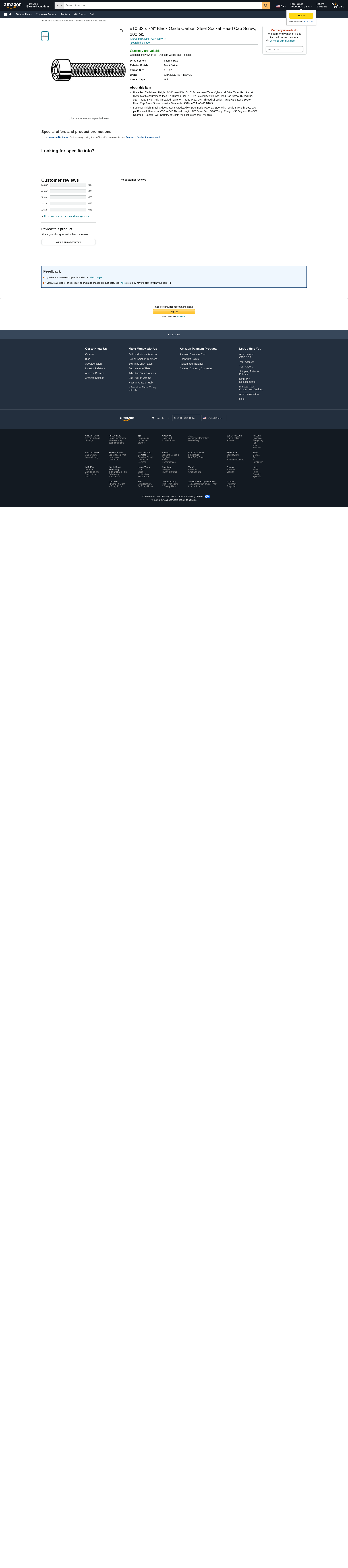 'Socket Head Cap Screw, System of Measurement Inch, Cylindrical, Basic Material Steel, Material Grade Alloy Steel, #10-32, Length 7/8 In., Fastener Finish Black Oxide, Fastener Thread Type UNF, Drive Type Hex Socket, Drive Size 5/16 In., Thread Style Fully Threaded, Thread Direction Right Hand, Thread Length 7/8 In., Head Height 1/16 In., Thread Dia. #10, Package Quantity 100'