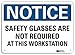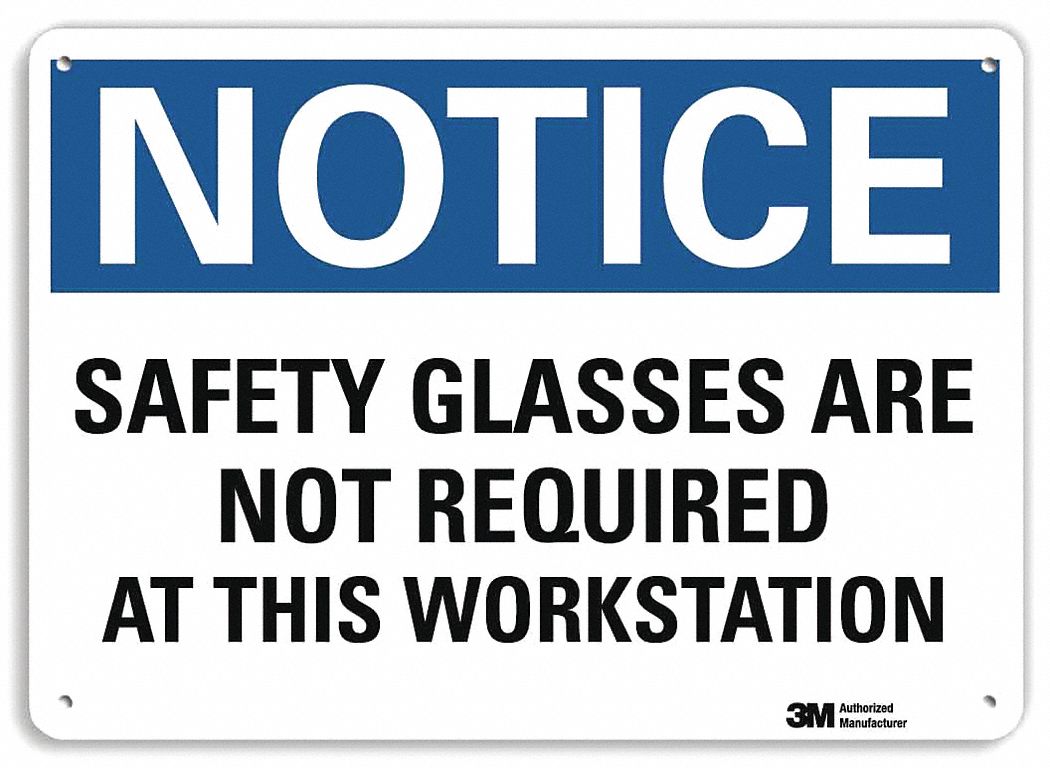 Notice Sign, Horizontal Rectangle, Number of Printed Sides 1, English, Sign Format Traditional OSHA, Sign Legend Safety Glasses Are Not Required At This Workstation, Sign Legend Background Color White, Sign Legend Style Text