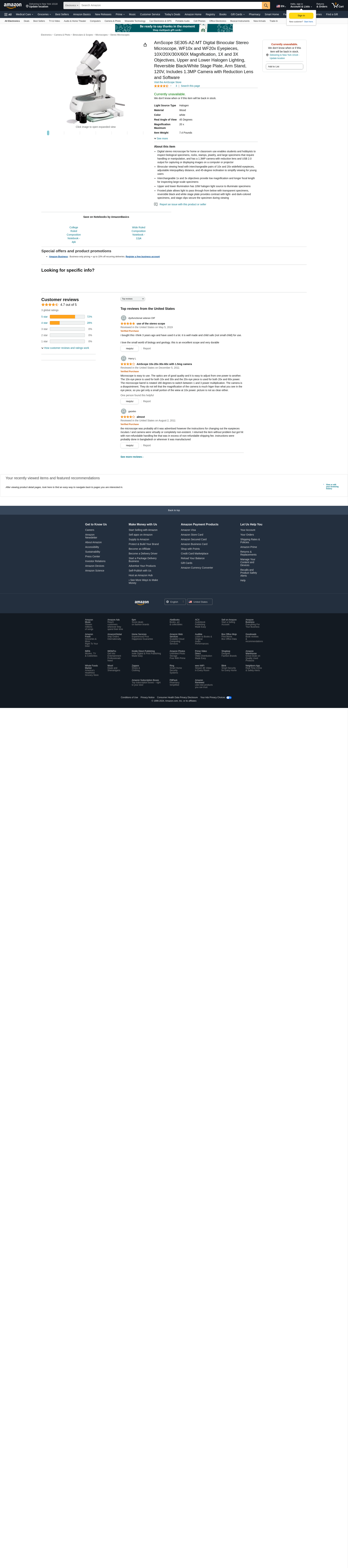Buy AmScope SE305-AZ-MT Digital Binocular Stereo Microscope, WF10x and WF20x Eyepieces, 10X/20X/30X/60X Magnification, 1X and 3X Objectives, Upper and Lower Halogen Lighting, Reversible Black/White Stage Plate, Arm Stand, 120V, Includes 1.3MP Camera with Reduction Lens and Software: Stereo Microscopes - Amazon.com ? FREE DELIVERY possible on eligible purchases