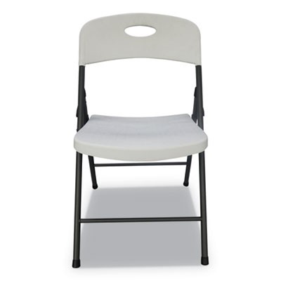 Molded resin folding chair is perfect for quick setups with large groups. Contoured seat and back for ergonomic comfort. Great for indoor and outdoor use. Heavy-duty steel and black anthracite powder coat finish resists corrosion and provides exceptional strength. Steel seat ring and double U-braces for stability and weight bearing which also prevents racking. Folds flat for compact storage. Top handle for easy grab and go, set-up and take-down. Recommended Applications: Breakroom & Hospitality; Conference, Training & Meeting; Seat/Back Color: White; Arms Included: No; Overall Width Maximum: 17 3/4".