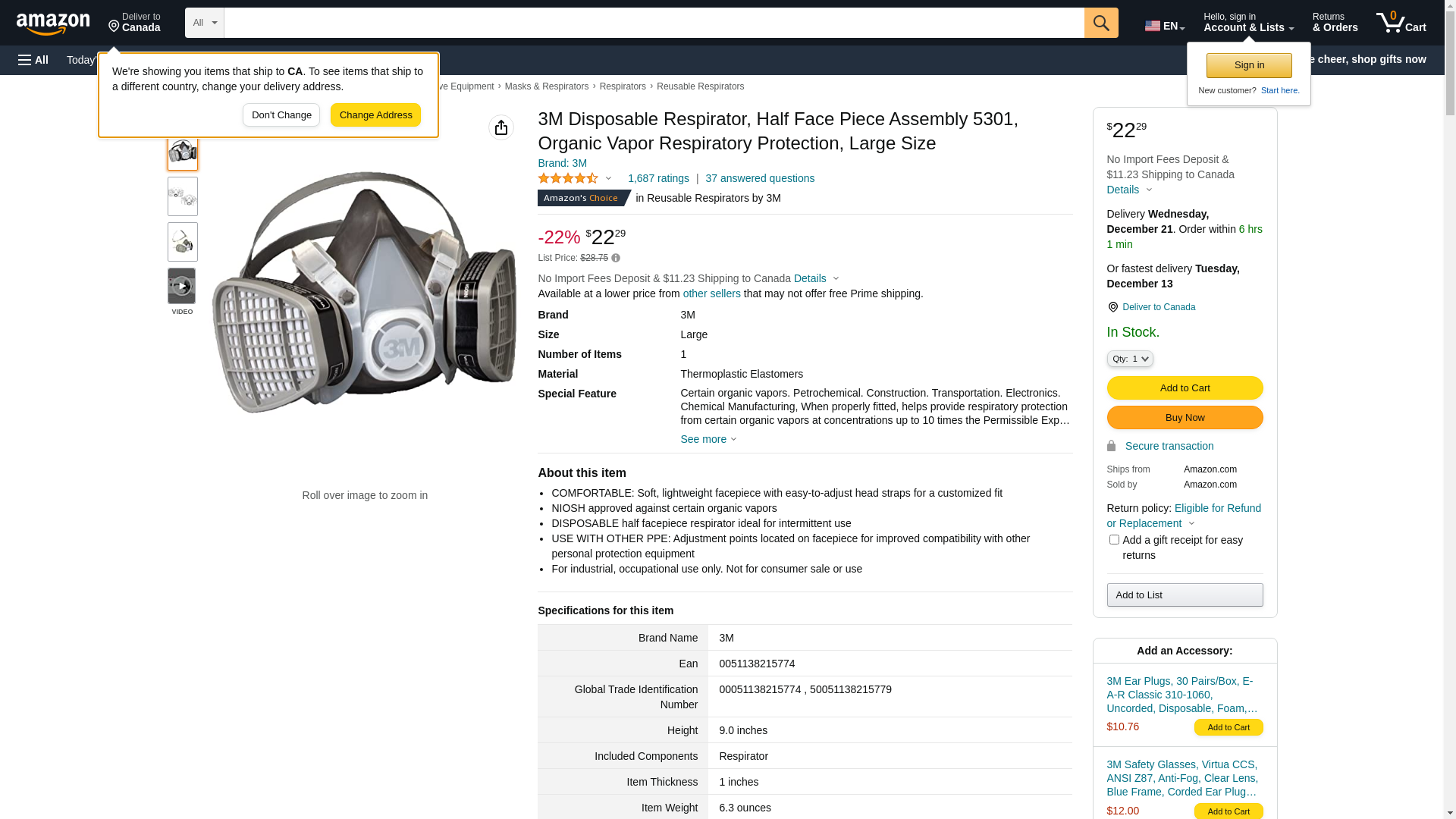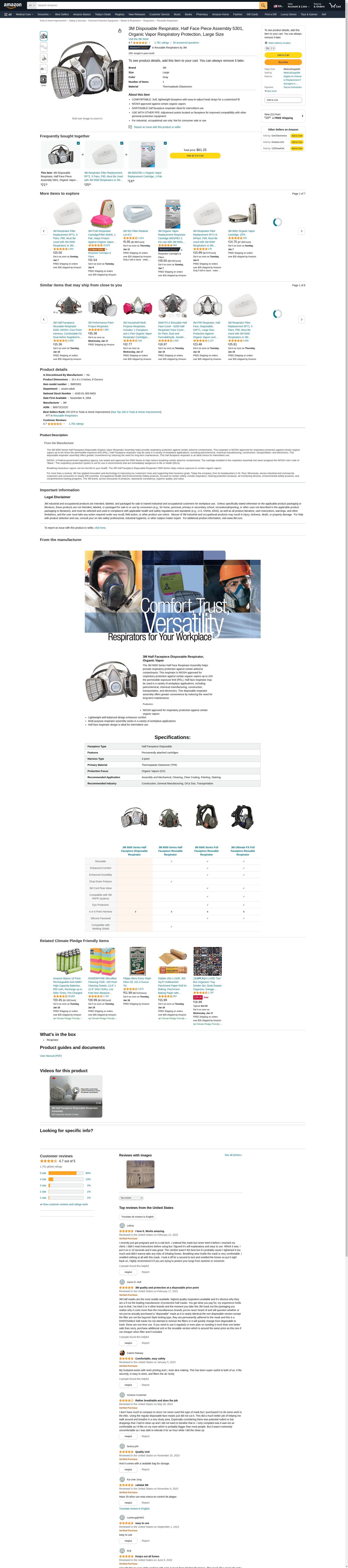 3M Half Facepiece Disposable Respirator Assembly 5301, Organic Vapor Respiratory Protection, Large(Pack of 1). NIOSH ...