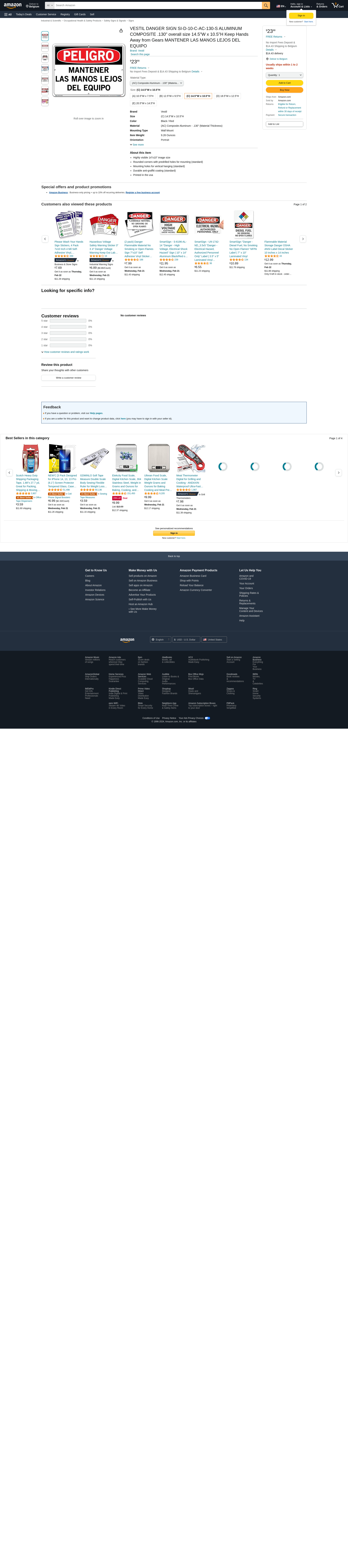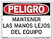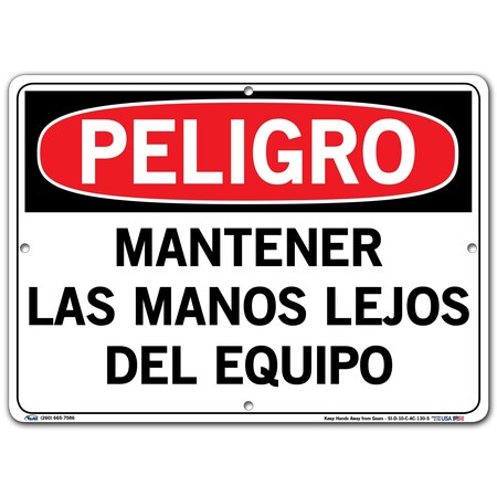 VESTIL DANGER SIGN SI-D-10-C-AC-130-S ALUMINUM COMPOSITE .130" overall size 14.5"W x 10.5"H Keep Hands Away from Gears MANTENER LAS MANOS LEJOS DEL EQUIPO
