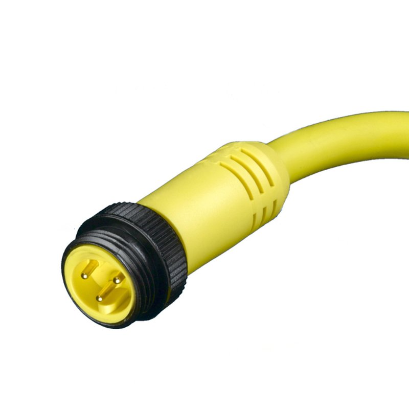 Mini-Change Cordset, 3 Pin, Single-Ended, Male Straight Connector. 16-3 Conductor, 12' Yellow PVC Cord. 13 Amp, 600V AC/DC. NEMA Rating: 6P. Includes: 1" Black Coupler. 7/8" Receptacle.