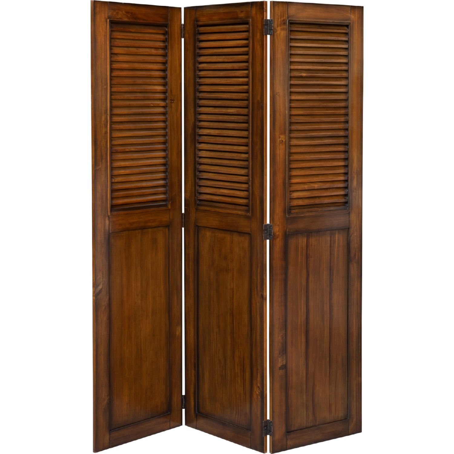 Bahama Shutter Wood Collection CF-1181-0158 54" Room Divider with 3 Panels Open Shutter Windows and Double-hinge Construction in Tropical Walnut
