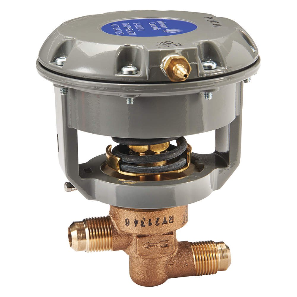 The 1/2 in. flared valve line accurately regulates the flow of hot or cold water in small HVAC terminal units. These 1/2 in. valves are available with a factory-installed V-3000-1 exposed type pneumatic actuator; enclosed actuators (V-3000-2) are also available (order separately). This valve style is available for field mounting the VA-805x Series electric actuators or with a factory-coupled VA-805x Series electric actuator.