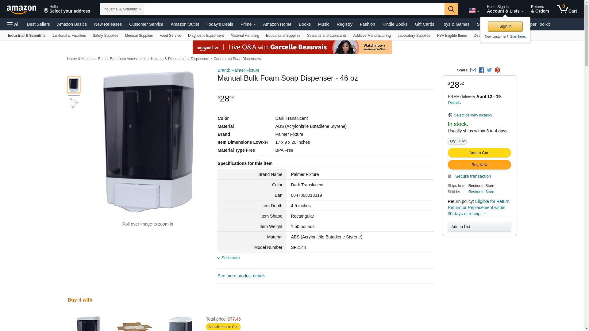 SF2144-01 Features: -Material: Impact resistant plastic. -Accepts most bulk foam soaps. -Dispenses approximately 4 ml per stroke. -Easy view of soap supply. -Capacity soap: 46 Oz. -Color: Dark translucent. Dispenser Type: -Soap Dispenser. Color(s): -Translucent Smoke. Material(s): -Plastic. Country of Manufacture: -United States. Dimensions: Overall Height - Top to Bottom: -20". Overall Width - Side to Side: -9". Overall Depth - Front to Back: -17". Overall Product Weight: -1.15 lbs.