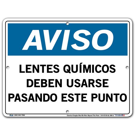 Vestil Notice SignSI-N-55-B-AL-080-S 55 12.5X9.5 Aluminum .080 Chemical Goggles Must Be Worn Beyond This Point LENTES QUÍMICOS DEBEN USARSE PASANDO ESTE Punto
