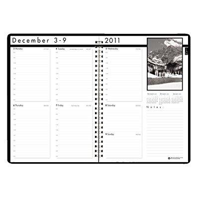 A different photo every week in subtle, crisp black and white. Bold printed weekly headbar. Soft suedelike cover. Appointment Ruling: 8 AM to 5 PM Mon.-Fri.; Cover Color(s): Black; Sheet Size: 8 1/2 x 11; Edition Year: 2012. This product is considered a dated product and is not returnable. This supplier will be closed on 11/24, 11/25, 12/23, 12/26, 1/2 for the holidays. The shipping cut off is UPS's cut off of 12/15 to try and have the products delivered by Christmas.