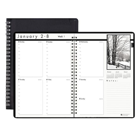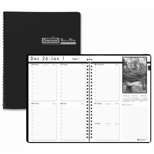Bulk 2022 Recycled Black & White Weekly Planners: HOD2171-02 (12 Planners) Appreciate the light and shadows and enjoy the wonders of nature while scheduling appointments or jotting down notes. January - December featuring 12 months for easy planning. Includes hourly appointment increments from 8:00 am to 5:00 pm within each day allow you to keep track of meetings. daily projects and week long goals. Three month reference calendars on each week. Week begins on a Monday. Includes printed monthly indicators to quickly find the date you need. Weeks are numbered to fit the need of every office application. Additional page with important holiday dates for 3 years in list form. Three-year calendar reference page for long-range planning. Julian dates and days remaining for quick reference. Black suede-liker cover with sleek. classic look. Strong wire binding firmly keeps the planner intact throughout the year. Printed on 100% post-consumer recycled FSC certified paper with soy inks. We take pride in our recycled material. the wire is 90% recycled and our book covers are 50% recycled. Made in the USA. Measures 8-1/2" x 11". House of Doolittle recycled calendars, planners and dated products are made from 100% recycled papers printed with natural soy ink. Bulk 2022 Recycled Black & White Weekly Planners: HOD2171-02.