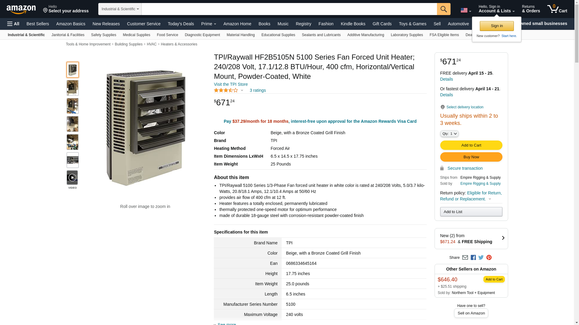 - TPI/Raywall 5100 Series 1/3-Phase Fan forced unit heater in white color is rated at 240/208 Volts, 5.0/3.7 kilo-Watts, 20.8/18.1 Amps, 12.1/10.4 Amps at 50/60 Hz