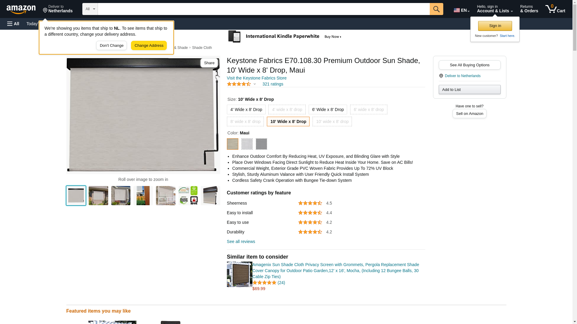 Keystone Fabrics E70.108.30 Premium Outdoor Sun Shade, 10' Wide x 8' Drop, Maui