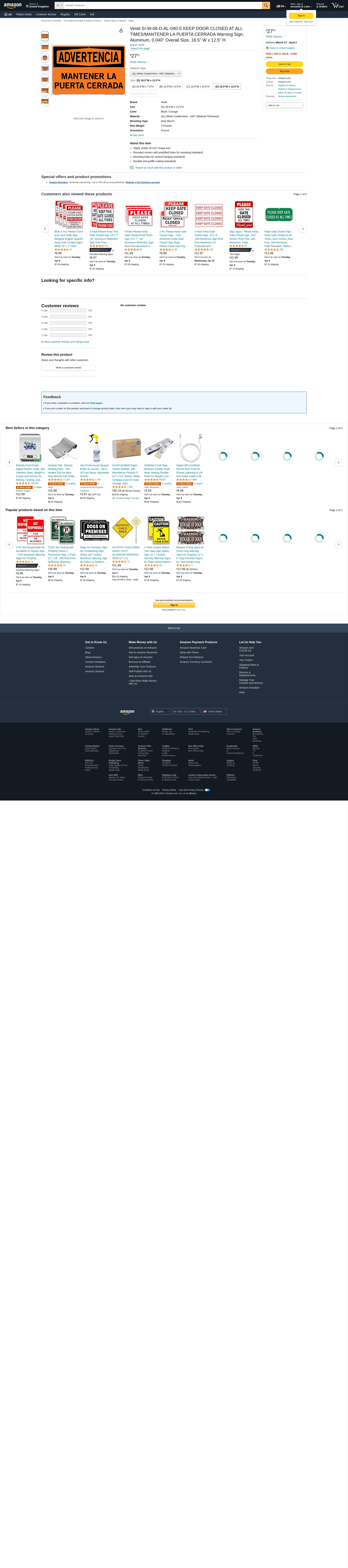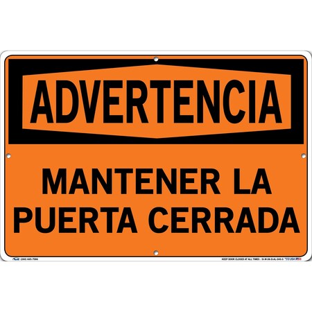Vestil SI-W-06-D-AL-040-S KEEP DOOR CLOSED AT ALL TIMES/MANTENER LA PUERTA CERRADA Warning Sign, Aluminum, 0.040" Overall Size, 18.5" W x 12.5" H