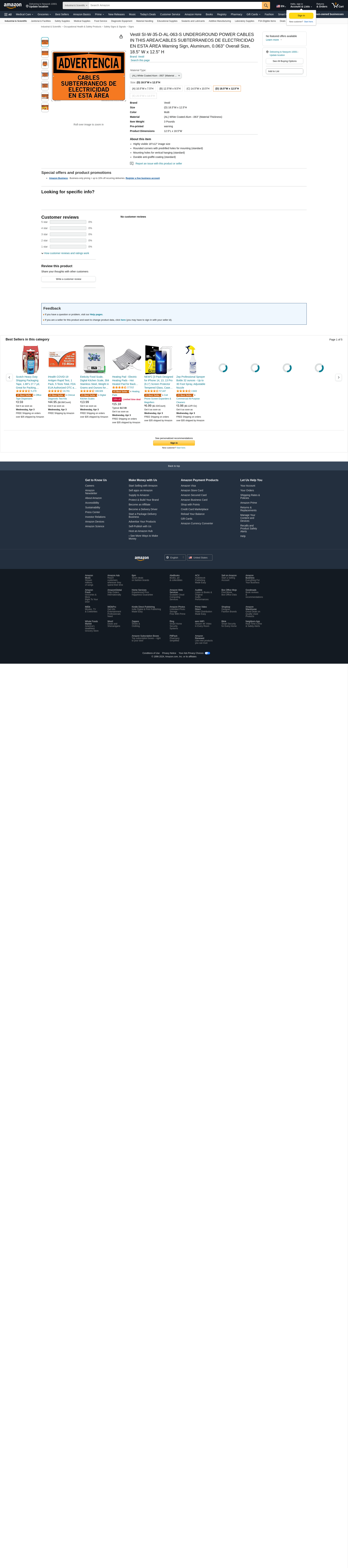 Vestil SI-W-35-D-AL-063-S UNDERGROUND POWER CABLES IN THIS AREA/CABLES SUBTERRANEOS DE ELECTRICIDAD EN ESTA ÁREA Warning Sign, Aluminum, 0.063" Overall Size, 18.5" W x 12.5" H