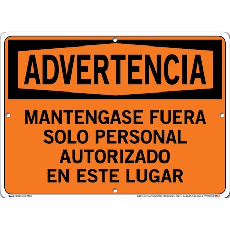 Vestil SI-W-47-C-AL-080-S KEEP OUT AUTHORIZED PERSONNEL ONLY/MANTENGASE FUERA SOLO PERSONAL AUTORIZADO EN ESTE LUGAR Warning Sign, Aluminum, 0.080" Overall Size, 14.5" W x 10.5" H