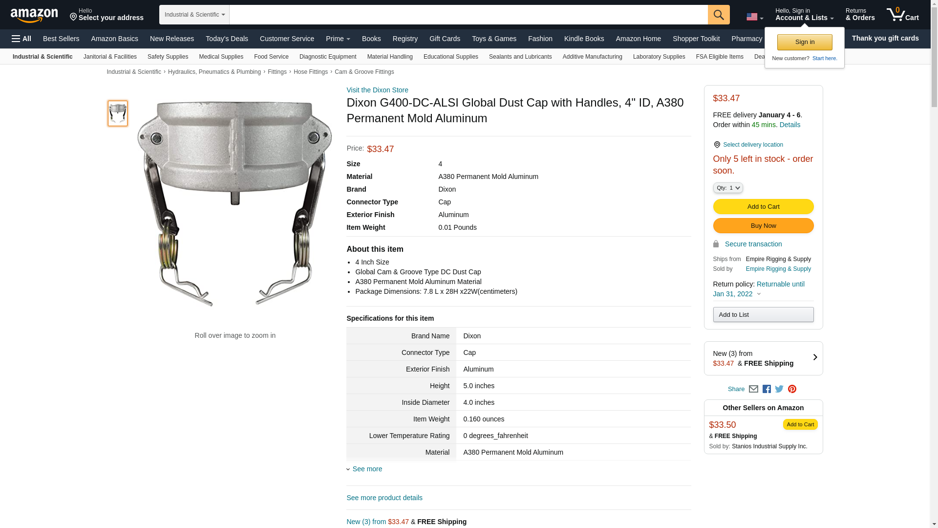 <p><strong>Dixon, G400-DC-ALSI, 4" Global Cam & Groove Type DC Dust Cap with Stainless Steel Handles</strong></p><p><strong>Specifications</strong></p><ul><li>Designed to interchange with all products produced to A-A-59326D</li></ul><p><strong>Features</strong></p><ul><li>Made to Dixon specifications and branded Dixon</li></ul><p><strong>Construction</strong></p><ul><li>Buna seals</li></ul><p><strong>Safety notes</strong></p><ul><li>Dust caps and dust plugs are not to be used in pressure applications for safety and environmental reasons.</li></ul>