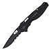 - Partially Serrated, 2.5-inch AUS-8 steel folding blade has a drop point shape with a hardcase black TiNi finish