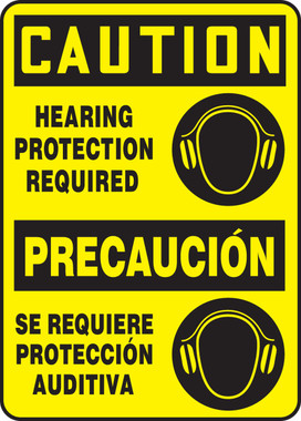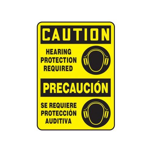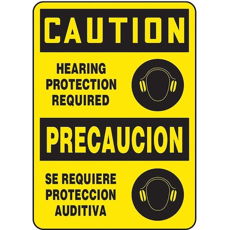 Accuform SBMPPA670VS Sign, Legend"Caution Hearing Protection Required/PRECAUCION SE REQUIERE PROTECCION", 14" Length x 10" Width x 0.004" Thickness, Adhesive Vinyl, 14" x 10", Black on Yellow