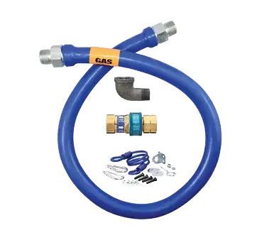 Dormont Blue Hose Moveable Gas Connector, 3/4" inside dia., 24" long, covered with stainless braid, coated with blue PVC, 1 SnapFast QD, 1 elbow, coiled restraining cable with hardware, 232,000 BTU/hr minimum flow capacity, limited lifetime warranty.