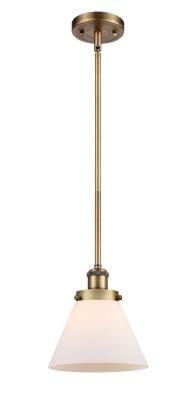 INNOVATIONS LIGHTING 916-1S-BB-G41-LED Large Cone 1 Light Pendant part of the Ballston Collection. Collection: Ballston. Metal Finish (Body): Brushed Brass. Metal Finish (Canopy/Backplate): Brushed Brass. Glass or Metal Shade Color: Matte White. Material: Steel, Cast Brass, Glass. Shade Material: Glass. Dimension(in): 10(H) x 8(W) x 8(Dia). Canopy Dimension(in): 0.75(H) x 4.5(Dia). Min/Max Height(With Shade, Cord or Included Stems & Canopy)(in): 18.75/42.75. Shade Size(in): 6(H) x 7.75(Dia). Bulb: (1) 3.5 Watt LED Vintage Medium Base Bulb Included. Voltage: 120. Dimmable: Yes. Color Temperature(Kelvin): 2700. CRI: 82. Lumens: 350. Sloped Ceiling Compatible: Yes. Glass Type: Frosted. Glass or Metal Shade Shape: Cone. Shade Fitter Measurement: 3.25 inch Fitter. Style: Industrial, Modern Contempo, Restoration-Vintage, Transitional . Ul Certification Type: Damp Location. Warranty: 2 Year Finish, Lifetime Electrical.
