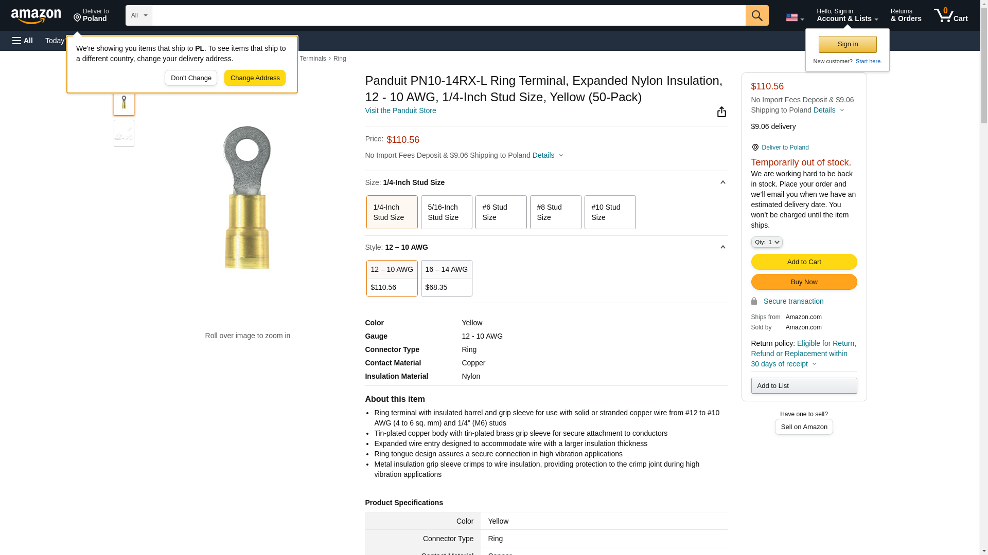 | Feature | Panduit Ring Terminal, Nylon Insulated, Expanded Insulation, Type PN-RX, Yellow Color |
