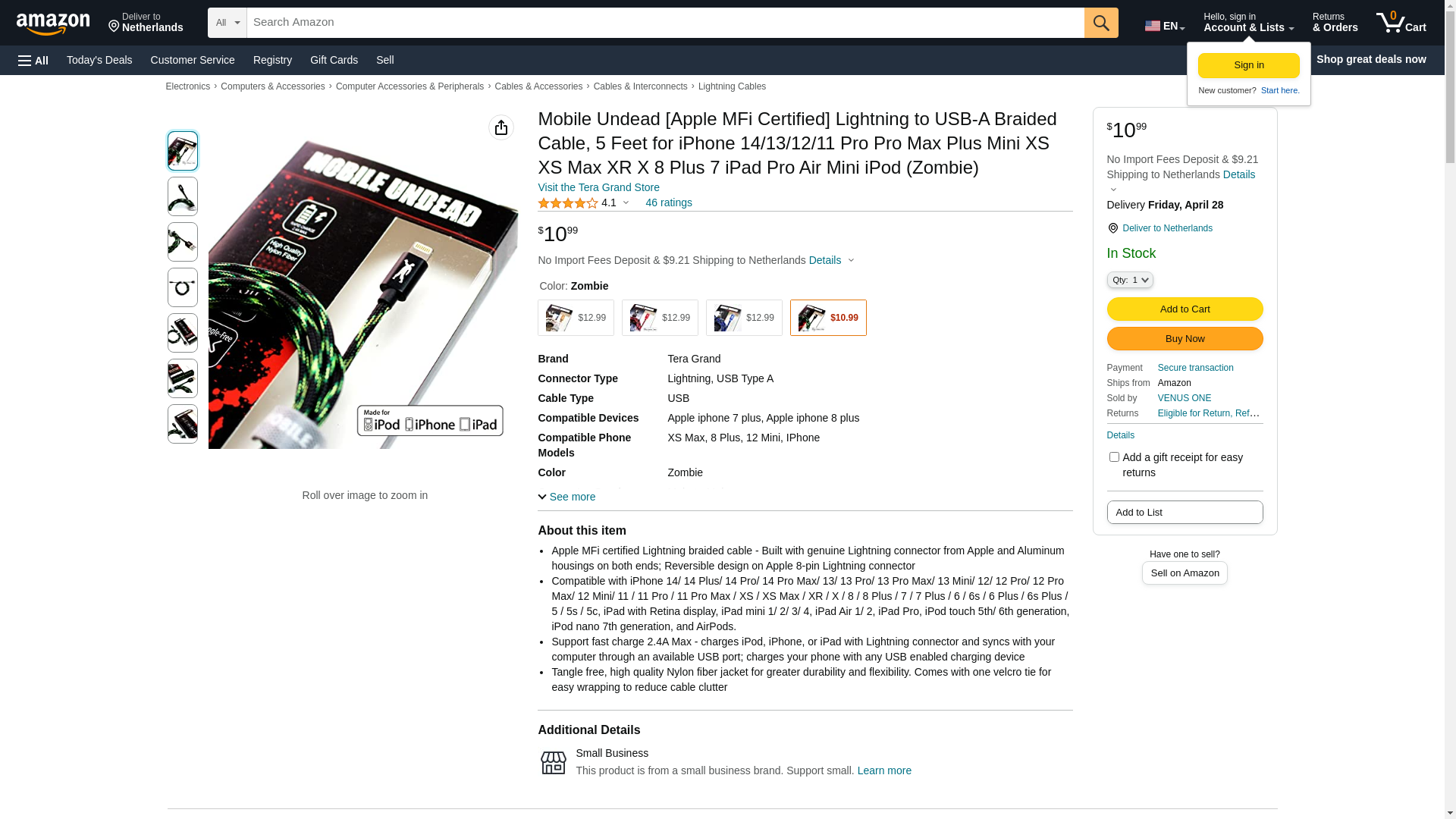 Tera Grand Mobile Undead [Apple MFi Certified] Lightning to USB-A Braided Cable, 5 Feet for iPhone 14/13/12/11 Pro Pro Max Plus Mini XS XS Max XR X 8 Plus 7 iPad Pro Air Mini iPod (Zombie)