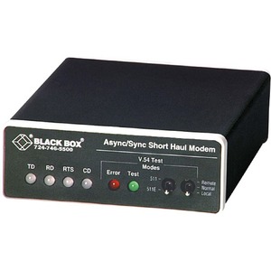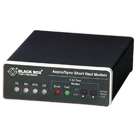 Async/Sync Short-Haul Modem. Send async or sync RS-232 data 7.6 miles at up to 56.7 kbps. This product includes: Async/Sync Short-Haul Modem Universal power supply with plug adapters for U.S. Europe, and The United Kingdom Quick Facts Sends your data 7.6 miles (12.2 km) at up to 56.7 kbps over 24 AWG wire (speed dependent). Further Details Async or sync, point-to-point or multipoint operation. Transformer isolation and surge protection. Internal, external, or receive recover clocking in sync mode. V.54 loopback and V.52 BERT pattern generator. Includes a universal power supply with plug adapters for U.S., Europe, and the United Kingdom. The BLACK BOX Async/Sync Short-Haul Modem sends your data 7.6 miles (12.2 km) at up to 56.7 kbps over 24 AWG wire. Need more than just high performance? This short-haul modem comes with lots of extras to simplify your data transmission. Transformer isolation and surge protection help to guard your valuable data, and front-panel controls make it easy to configure diagnostics. Of course, the Async/Sync Short-Haul Modem has all the standard features you're used to: async or sync operation, the option of running point-to-point or multipoint applications, and half-duplex operation over two wires or your choice of half- or full-duplex over four wires.