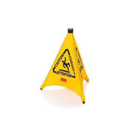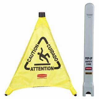The Rubbermaid Commercial Pop-Up Safety Cone with Multi-Language Imprint and Wet Floor Symbol is collapsible and automatically deployed. The caution sign features the universal wet floor symbol and the word ôcautionö imprinted in English, French and Spanish for effective communication to broad audiences. The caution cone is durable, yet folds compactly when not in use. The plastic cone features a wall-mounted storage tube that allows for easy and compact storing. The bright yellow design meets OSHA requirements while the multilingual graphics are ANSI compliant. Made from durable materials, this safety sign can withstand serious abuse. Depicted Text: Caution; Attention; Cuidado; Width: 21"; Depth: 21"; Height: 30".