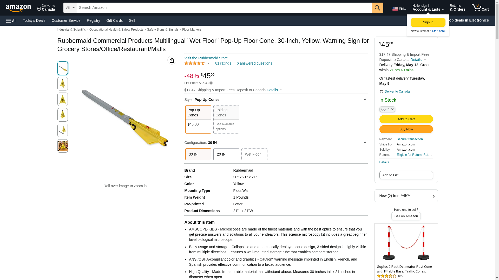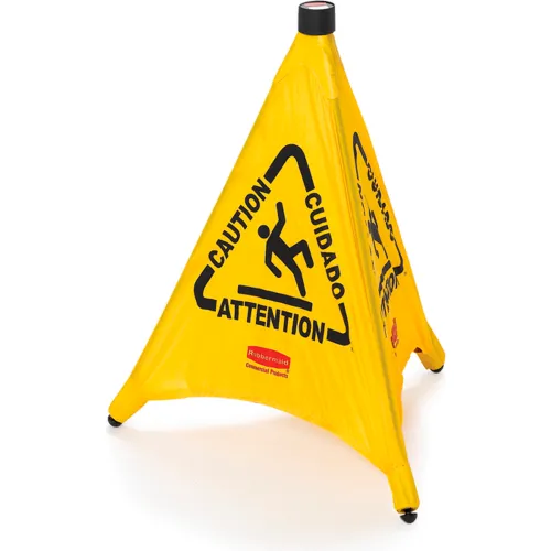 Pop-Up safety cone features 3-sided multi-lingual caution and wet floor symbol. Top of cone offer label space for location assignment Safety sign folds for compact storage in tube; automatically opens for use Multi-lingual safety sign offers a high visibility yellow finish to alert personnel and customers of possible dangers and to take caution ANSI compliant Measures 21 sq x 30H