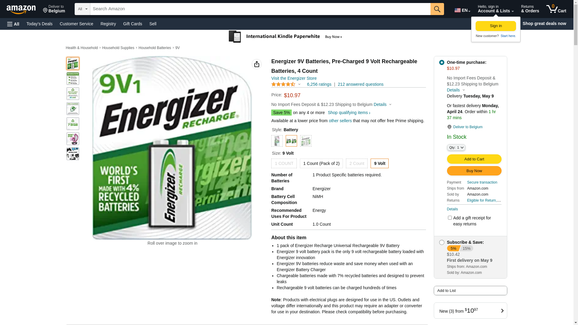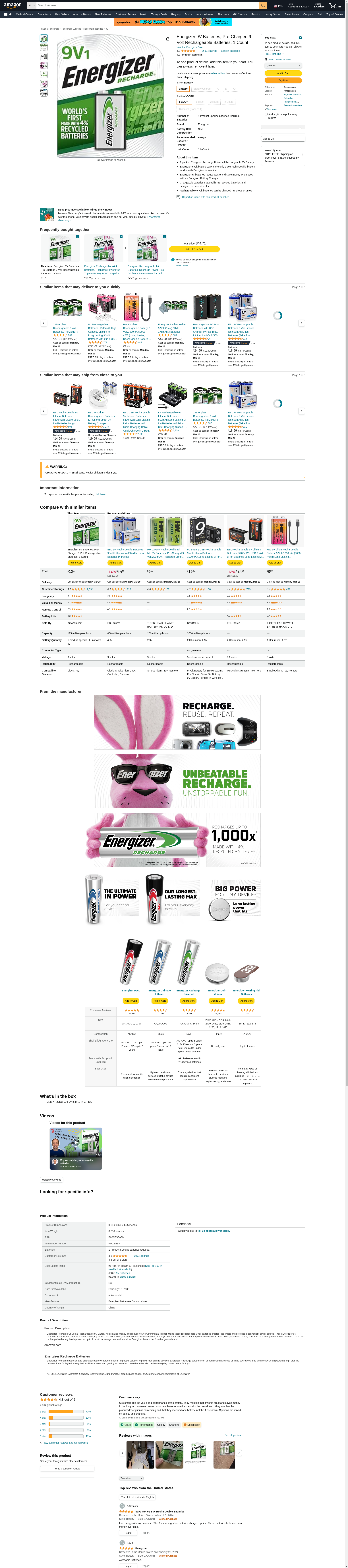 | Feature | 1-pack of Energizer Recharge Universal 2000 mAh NiMH 9V rechargeable batteries |